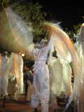 The legend of Icarus tells us that technology will not ultimately satisfy our desire to transcend our earthbound selves. True flight occurs on wings of the mind, whether on the mythic wings of angels and demons, or the virtual wings of today's digital avatars of the gaming universe. Four stilt-walkers avatars appear in Act III, waering translucent wings and traditional West Indian screen masks enter the playing area. Their 9 attendants are tall abstract “spirit poles” loosely figurative yet ethereal and formless.